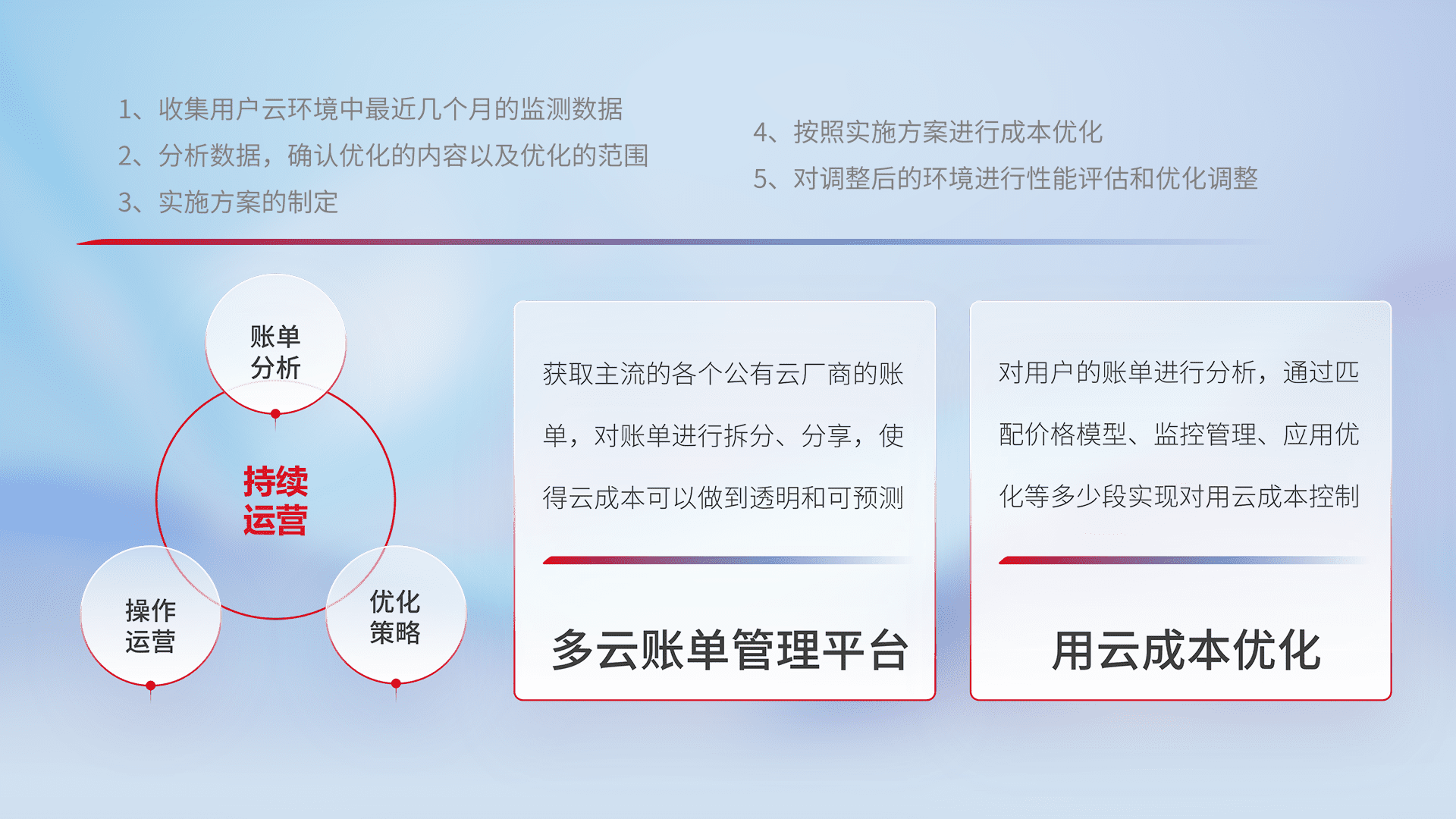通过多云纳管,,,以统一的资源数据模型把客户的云资源进行抽象和封装,,进而实现对多云资源的统一操作,,,保障云资源管理的可靠性、、稳定性与可用性。。。。量身定制化运维内容,,配置、、开发运维、、、补丁管理、、、备份、、、、监控、、、认证和访问管理、、、审计和日常巡检等,,,保障在用云过程中的可靠度,,,稳定度以及高可用率。。。。